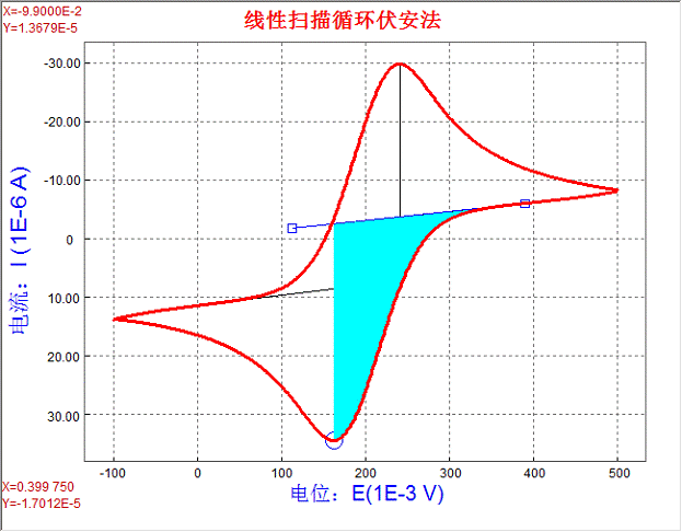 2. 即第三和第四段曲線,根據(jù)循環(huán)伏安曲線特點(diǎn),用半峰法進(jìn)行峰測量,測量結(jié)果如圖: